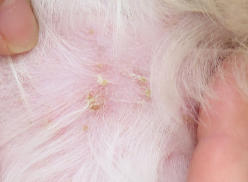 症状は、食欲不振、多飲多尿、陰部からオリモノの排出、嘔吐などが見られます。