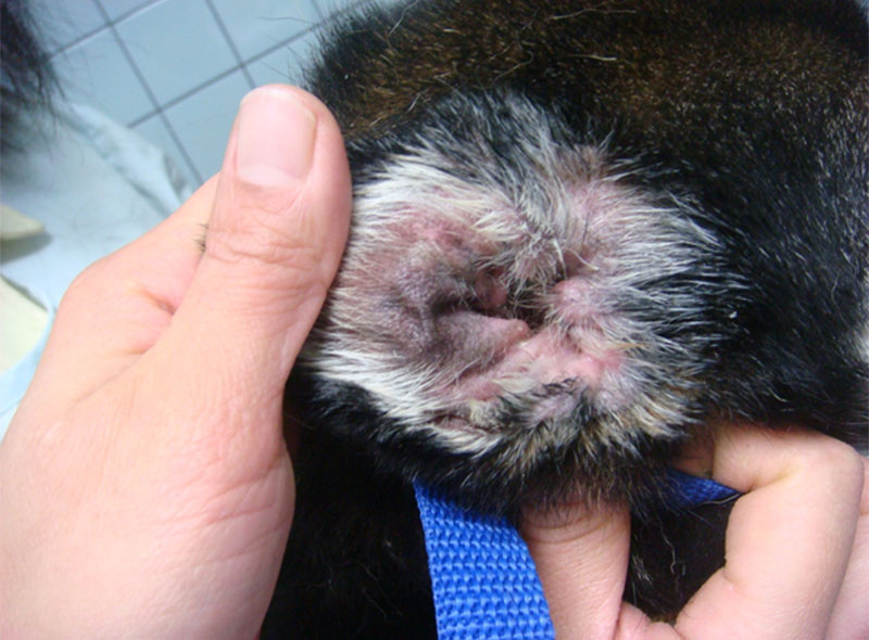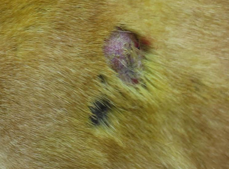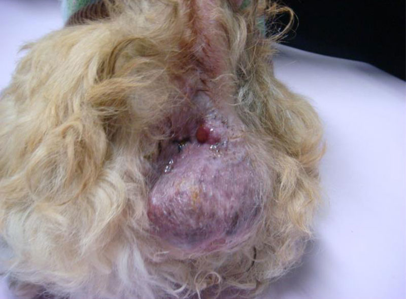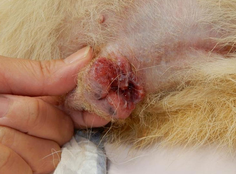 肛門の周りには、肛門周囲腺という分泌腺があり、男性ホルモンにより良性の腫瘍を生じ、これを肛門周囲腺腫と言います。比較的成長が早く、小さくても潰瘍化し出血することがあり、常にかさぶたができたような状態になることがあります。