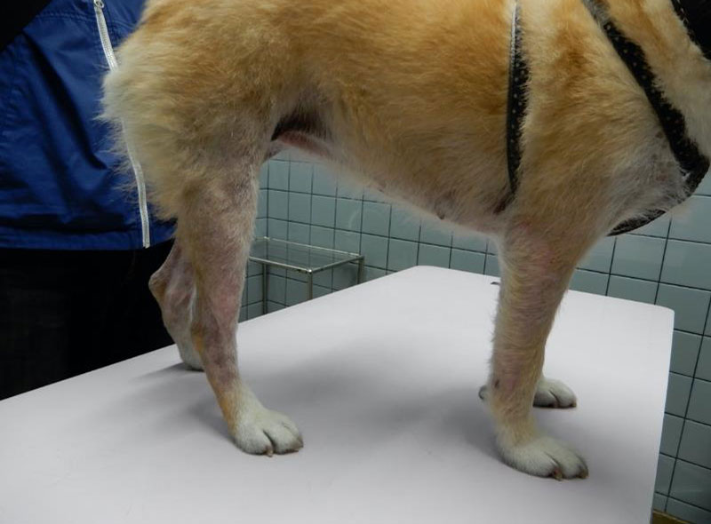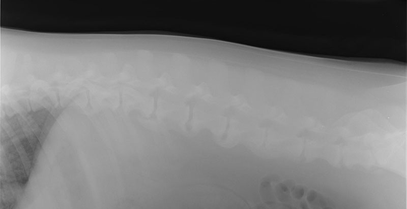 変性性腰仙椎狭窄症が最も多い原因で、いわゆる腰痛症です。馬尾神経は腰にあり、腰のあたりを触られるのを嫌がる、尾をあげない、キャン鳴きする、すぐ座る、後ろ足を引きずる、太ももが痩せるなどの症状が見られます。